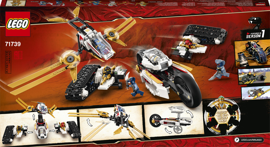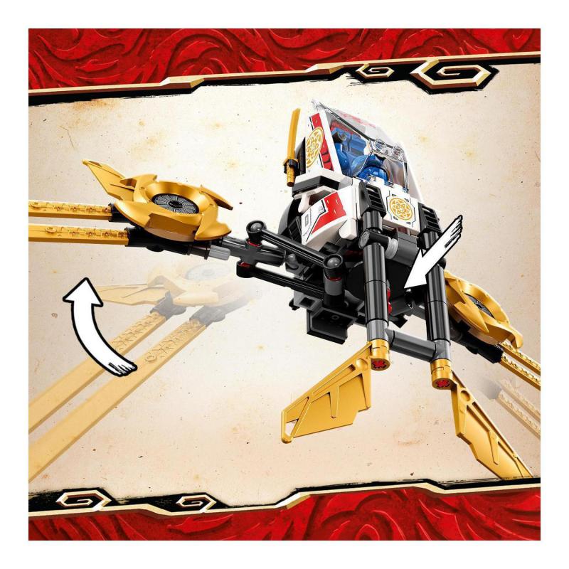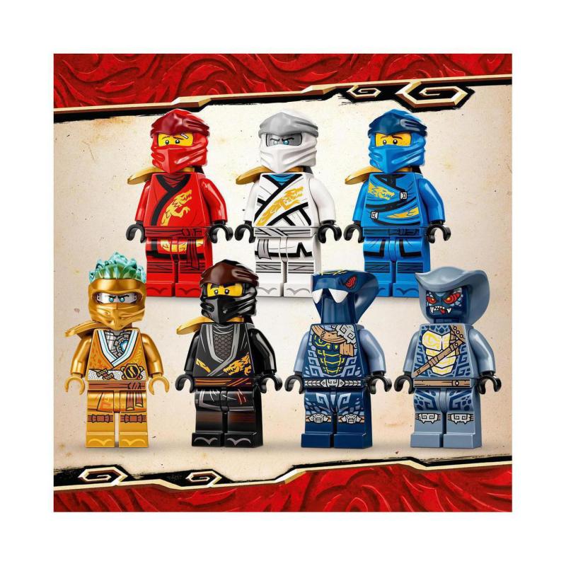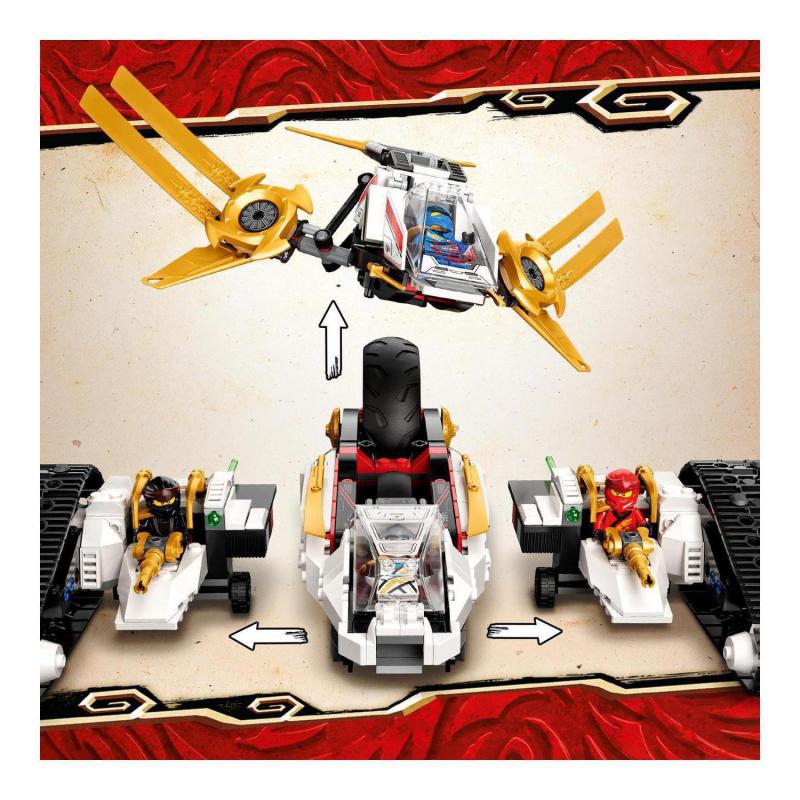 S touto moderní verzí nadzvukového útočníku si děti mohou přehrávat příběhy z 1. řady televizního seriálu Lego Ninjago. Model 4v1 lze rozebrat na motorku, tryskáč s pružinovými vystřelovači a 2 terénní vozidla.S touto moderní verzí nadzvukového útočníku si děti mohou přehrávat příběhy z 1. řady televizního seriálu Lego Ninjago. Model 4v1 lze rozebrat na motorku, tryskáč s pružinovými vystřelovači a 2 terénní vozidla. V této unikátní stavebnici najdete 7 minifigurek: nindži Kaie, Zanea, Colea a Jaye, a navíc hadí válečníky Mezma a Rattla z kmene Hypnobraiů. Děti tak budou mít spoustu příležitostí k přehrávání napínavých bojů. Sada také obsahuje zbrusu novou sběratelskou minifigurku zlatého Zanea z edice Legacy, která vyjde v červnu 2021 k příležitosti 10. výročí hraček Ninjago. Úžasné vozidlo 4v1 pro přehrávání dobrodružství s nindži. Obsahuje 7 minifigurek: Jaye, Kaie, Colea, Zanea, Zanea Legacy, Mezma a Rattla. Hrajte si s motorkou, tryskáčem nebo jedním ze 2 terénních vozidel.