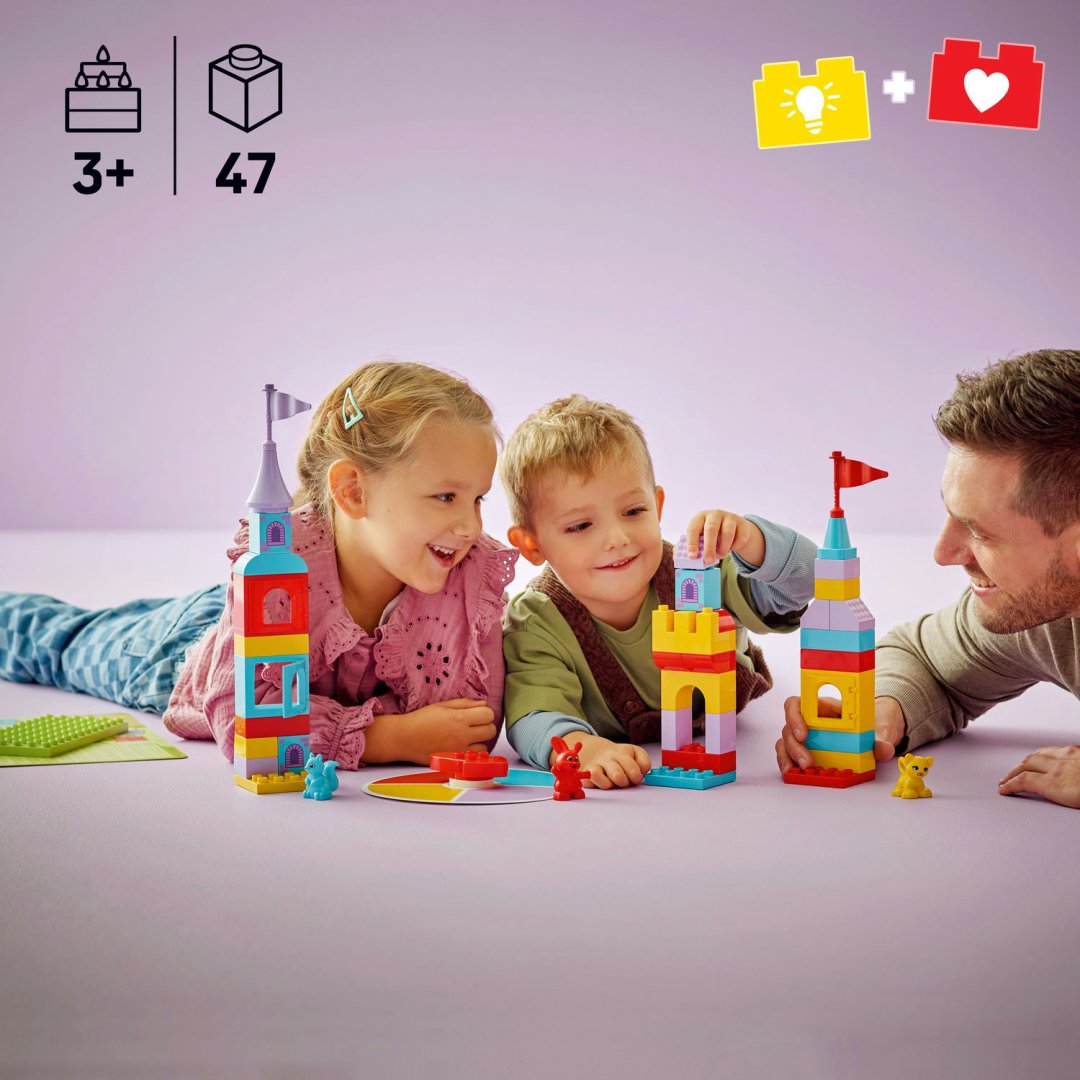 Užijte si se svou ratolestí hodiny rodinné zábavy a pomozte jí učit se hrou se stavebnicí 2v1 Lego Duplo Hopsy a hra s hradem.Užijte si se svou ratolestí hodiny rodinné zábavy a pomozte jí učit se hrou se stavebnicí 2v1 Lego Duplo Hopsy a hra s hradem. Děti se vydají na vzdělávací dobrodružství Lego Duplo a procvičí si počítání a třídění barev během hraní jedné ze dvou zábavných her. Děti se naučí poznávat barvy a čísla během kreativního stavění modelu hradu. Tato zábavná rodinná aktivita začíná tím, že si každý hráč vybere zvířátko a poté roztočí šipku, aby zjistil, o kolik míst na hrací ploše se může posunout. Do modelu pak přidá jednu kostku v té barvě, na které přistál. Hra končí, když všechny postavy dorazí na hrad. Ve druhé hře děti třídí barvy, aby zjistily, kdo dokáže postavit nejvyšší věž. Každý hráč roztočí šipku a zjistí, jakou barvu kostky může přidat do svého modelu.