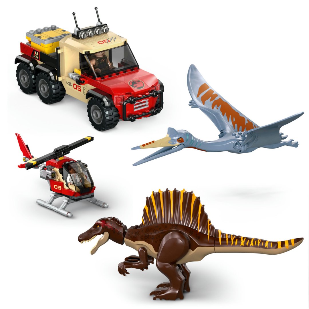 Děti a fanoušci od 8 let se s interaktivní stavebnici Lego Jurassic World Letecká mise se spinosaurem a quetzalcoatlem můžou těšit na dinosauří dobrodružství.Děti a fanoušci od 8 let se s interaktivní stavebnici Lego Jurassic World Letecká mise se spinosaurem a quetzalcoatlem můžou těšit na dinosauří dobrodružství. Tento dinosauří dárek pro kluky a holky inspirovaný filmem Jurassic World: Rebirth obsahuje 2 tvarované figurky dinosaurů a 4 filmové postavy: Martina Krebse, Zoru Bennettovou, Duncana Kincaida a Dr. Henryho Loomise. Spinosaurus má pohyblivé nohy, paže, ocas, hlavu a čelist. Quetzalcoatlus má pohyblivá křídla a čelist. Součástí stavebnice je navíc starobylý chrám s vodopádem, past s padajícími sekerami, rozpadající se sloupy, hnízdo a vejce. Nechybí také helikoptéra, náklaďák, pouzdro na injekční stříkačky, 3 injekční stříkačky a spousta dalších prvků.