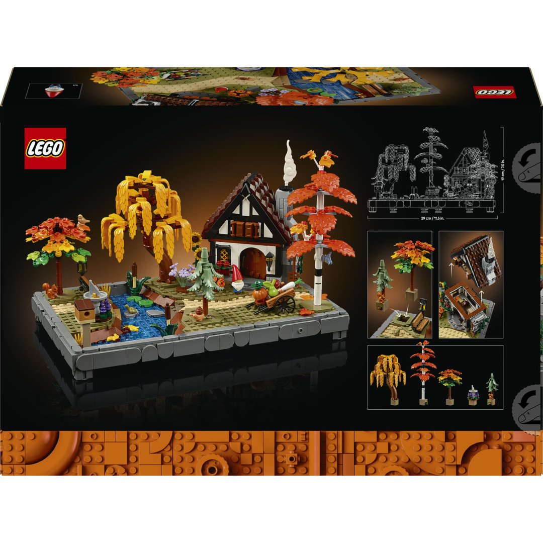 Zachyťte podzimní atmosféru se stavebnicí Lego Icons Chata a podzimní zahrada pro dospělé. Vytvořte sezónní dekoraci plnou podzimních barev.Zachyťte podzimní atmosféru se stavebnicí Lego Icons Chata a podzimní zahrada pro dospělé. Vytvořte sezónní dekoraci plnou podzimních barev. Uvolněte se při sestavování propracovaných detailů a poté přeskupte stromy, rostliny a dekorativní prvky a vytvořte si pestrou dekoraci domů nebo do kanceláře. Celý model je umístěn na základně s kamenným obrubníkem, která vytváří pevný a stabilní podklad. Stavebnice je určena především pro dospělé stavitele, kteří ocení pečlivé detaily a možnost kreativního uspořádání jednotlivých prvků. Model zahrnuje několik výrazných stromů s podzimními barvami listí, například břízu s typickými bílými kmeny a oranžovými listy, vrbu s visícími žlutými větvemi, smrk a javor s barevným listím v odstínech červené, oranžové a žluté. Tyto stromy lze podle potřeby přemístit, což umožňuje variabilitu v aranžmá celé scény. Zahrada je doplněná o drobné detaily jako jsou sluneční hodiny, ptačí budka na stromě, lavička či vozík plný zeleniny, které dodávají modelu autentický a živý charakter. Chata je postavena v tradičním stylu s tmavě hnědou střechou pokrytou šindeli a bílými stěnami s dřevěnými prvky. Střecha je odnímatelná, což umožňuje nahlédnout dovnitř do útulné kuchyně, vybavené například sporákem či pracovním stolem. Celý prostor scény je doplněn o různé květiny a rostliny, které podtrhují přírodní a poklidnou atmosféru podzimní zahrady. Nechybí ani drobná zvířátka jako veverka, červenka nebo brhlík, která jsou přidána jako malé figurky, čímž se model stává ještě živějším.