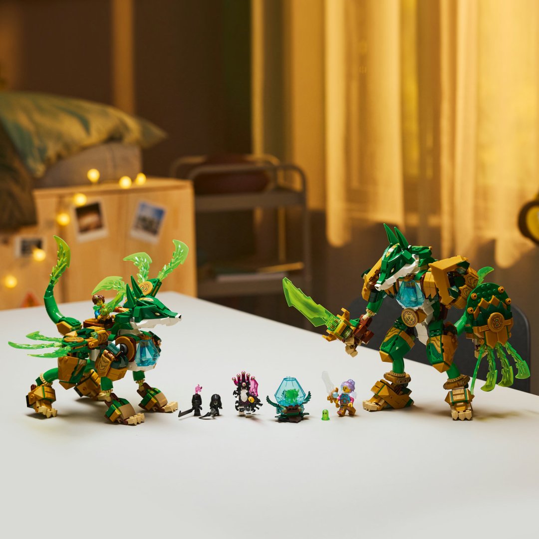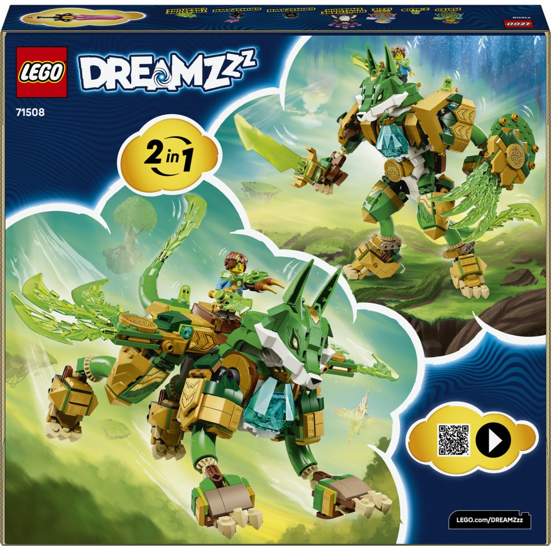 Lego DREAMZzz Liščí robotický strážce je stavebnice určená dětem od 9 let, která nabízí nejen kreativní skládání, ale i bohatý příběh a možnost hrát si s různými postavami a modely.Lego DREAMZzz Liščí robotický strážce je stavebnice určená dětem od 9 let, která nabízí nejen kreativní skládání, ale i bohatý příběh a možnost hrát si s různými postavami a modely. Tento set umožňuje postavit fantastického liščího válečníka v podobě robotického strážce. Díky 2v1 konstrukci si děti mohou vybrat mezi dvěma verzemi modelu – mohutným liščím válečníkem stojícím na dvou nohách, vybaveným mečem a štítem, nebo majestátním liščím strážcem se čtyřmi nohami a křídly, který působí jako impozantní ochránce. Model je sestaven z barevných dílků v odstínech zelené, zlaté a bílé, což mu dodává přírodní a zároveň magický vzhled. Transparentní zelené prvky na křídlech, ocasu a meči evokují energii a sílu, kterou tento robotický strážce představuje. V setu nechybí ani minifigurky klíčových postav – Matea, Izzie a císaře z nočních můr, každý vybavený vlastním mečem laděným do barev jejich charakterů. Kromě nich jsou součástí i malé figurky šklebounů, Z-Fleka a diamantové vejce, ze kterého se líhne zelené pokladové stvoření, což přidává další rozměr zábavy a roleplay.
