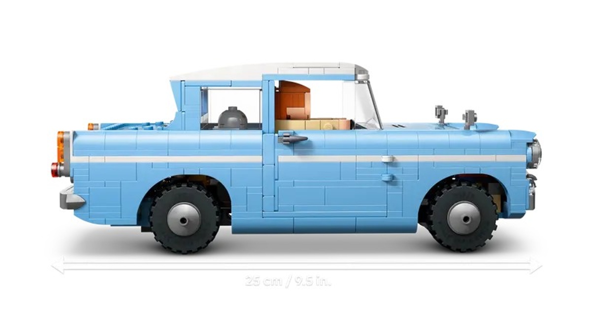 Lego sada představuje detailně propracovaný model kouzelného létajícího auta Ford Anglia, který je ikonickým vozidlem rodiny Weasleyových ze světa Harryho Pottera.Lego sada představuje detailně propracovaný model kouzelného létajícího auta Ford Anglia, který je ikonickým vozidlem rodiny Weasleyových ze světa Harryho Pottera. Tento model je vyroben z 868 dílků a je určený pro stavebníky od 14 let. Auto je zhotoveno převážně v jemné světle modré barvě s bílou střechou a obsahuje realistické detaily, jako jsou průhledná okna, funkční dveře a kufr, které lze otevírat. Na přední části vozu nechybí charakteristické kulaté světlomety a registrační značka „7990 TD“. Do interiéru vozu lze posadit dvě Lego figurky představující postavy Rona Weasleyho a Harryho Pottera, které mají charakteristické výrazy obličeje evokující scény z filmu. Součástí modelu je také malá soví figurka Hedvika a unikátní kufr s motivem Bradavic, který lze z kufru vystřelit díky speciální funkci evokující kouzelný prvek z příběhu. Tato funkce přidává hře na interaktivitě a umožňuje znovu prožívat filmové momenty.